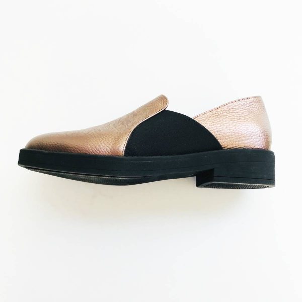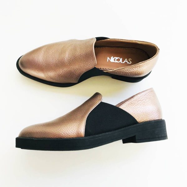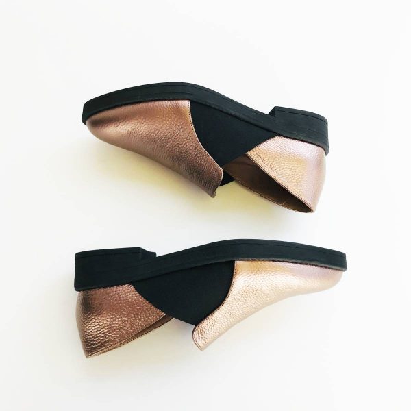 Mocasini dama din piele naturala, culoare „bronze” plus negru realizati manual in atelierele noastre din Romania.