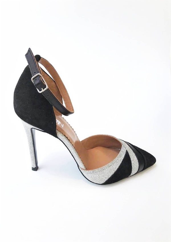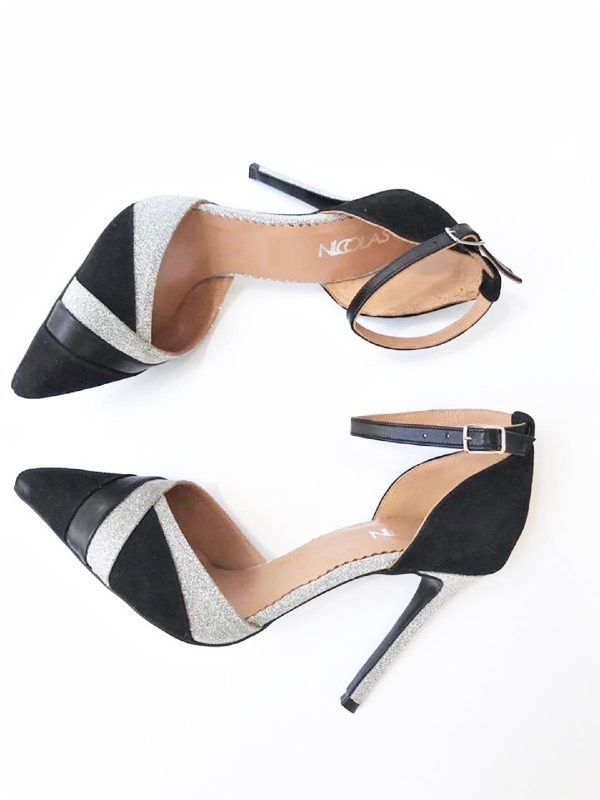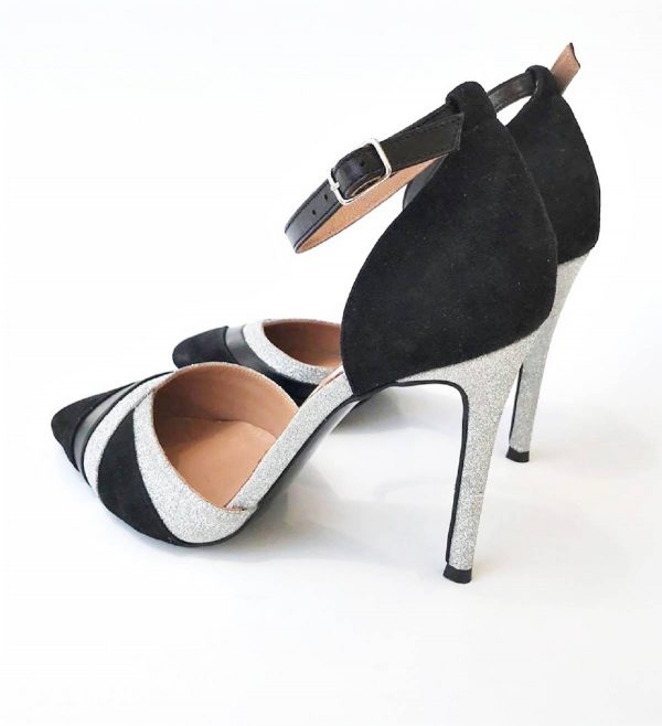 Sandale dama cu toc din piele naturala, negru clasic si glitter argintiu realizate manual in Romania.