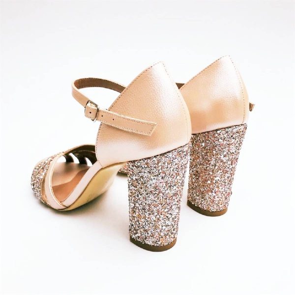 Sandale dama cu toc din piele naturala ”nude” si glitter ”gold” multicolor realizate manual in Romania.